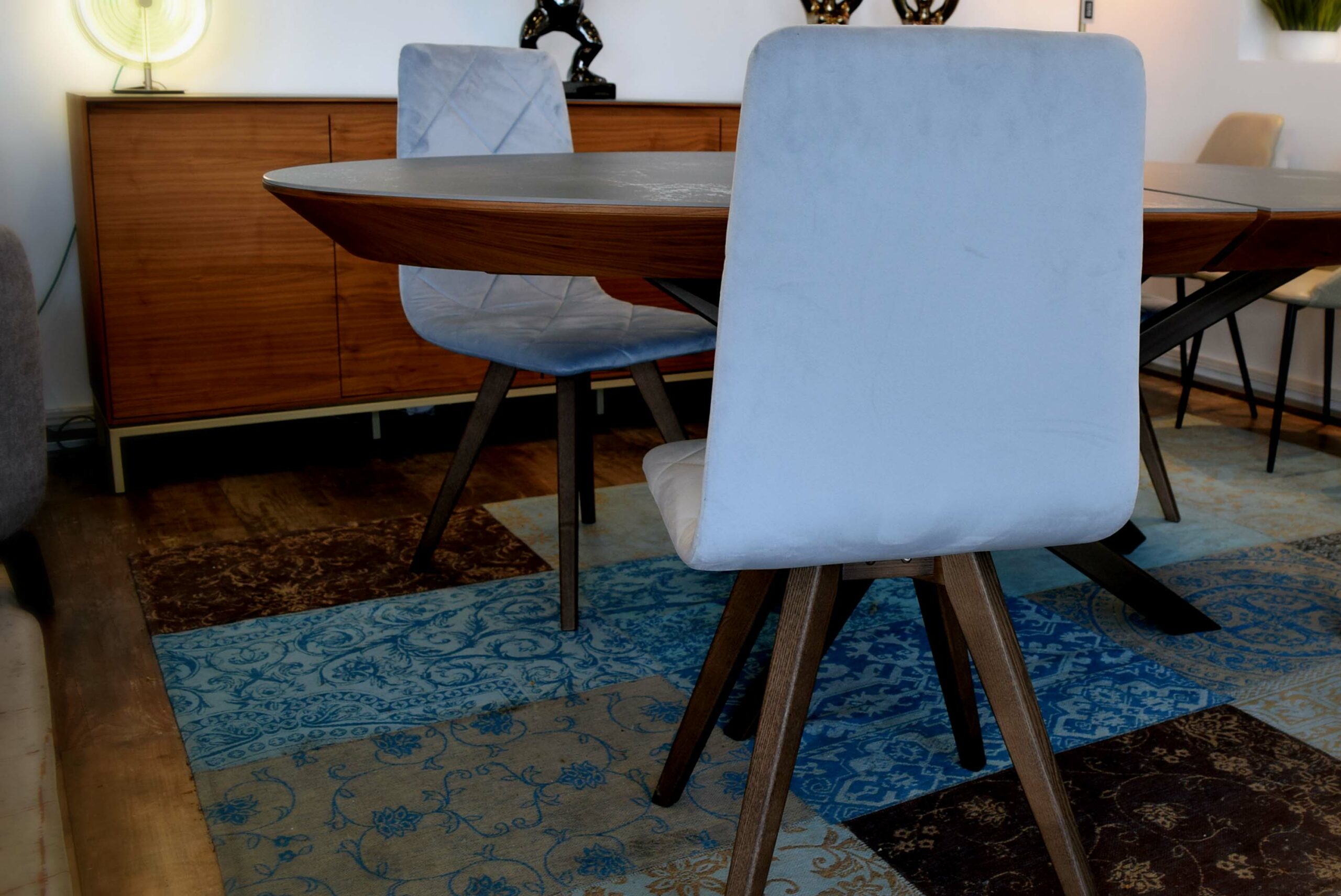 Cet ensemble incarne l’équilibre parfait entre l’esthétique spectaculaire et la fonctionnalité durable. Chaque pièce a été pensée comme un investissement dans votre art de vivre : la céramique « Bleue Rouille » capte la lumière avec une profondeur saisissante, tandis que l’ingéniosité des pieds et du velours traité assure une sérénité face aux aléas du quotidien.
