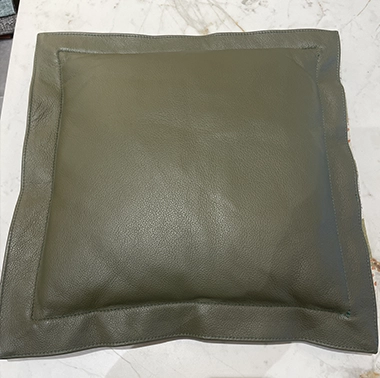 L’ensemble est accompagné d’un coussin bi-matière unique, associant le tissu et le cuir vachette pour une finition sophistiquée.